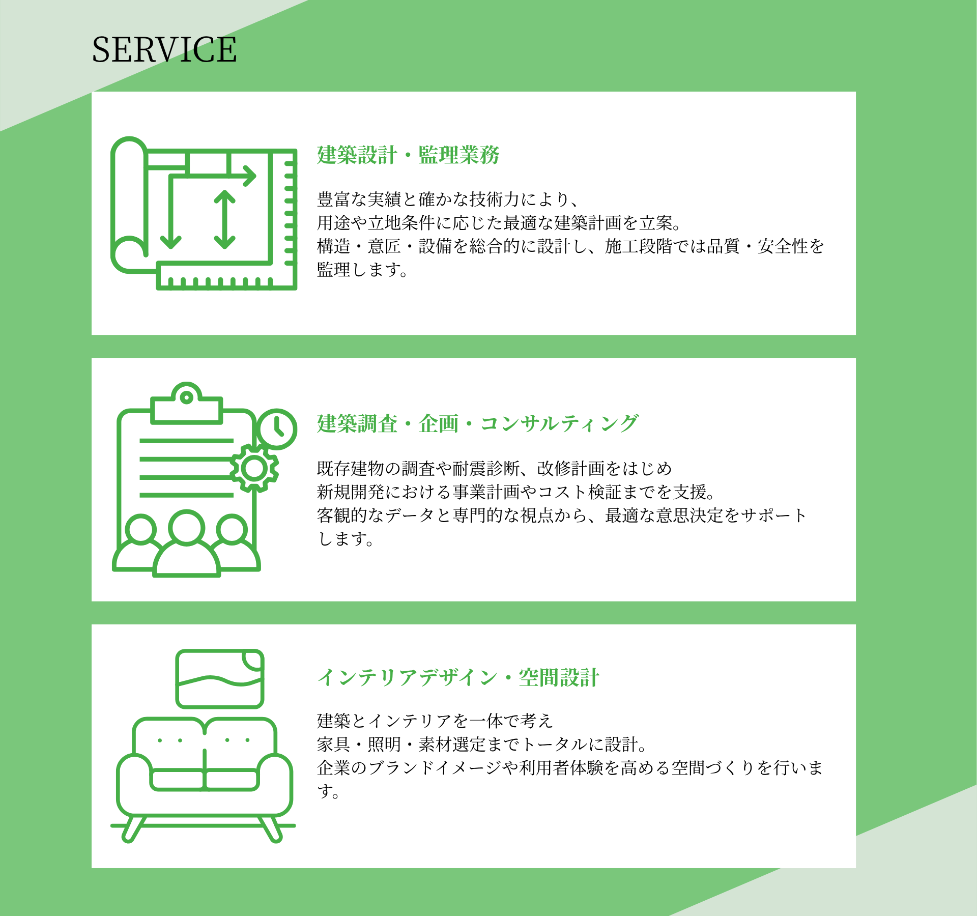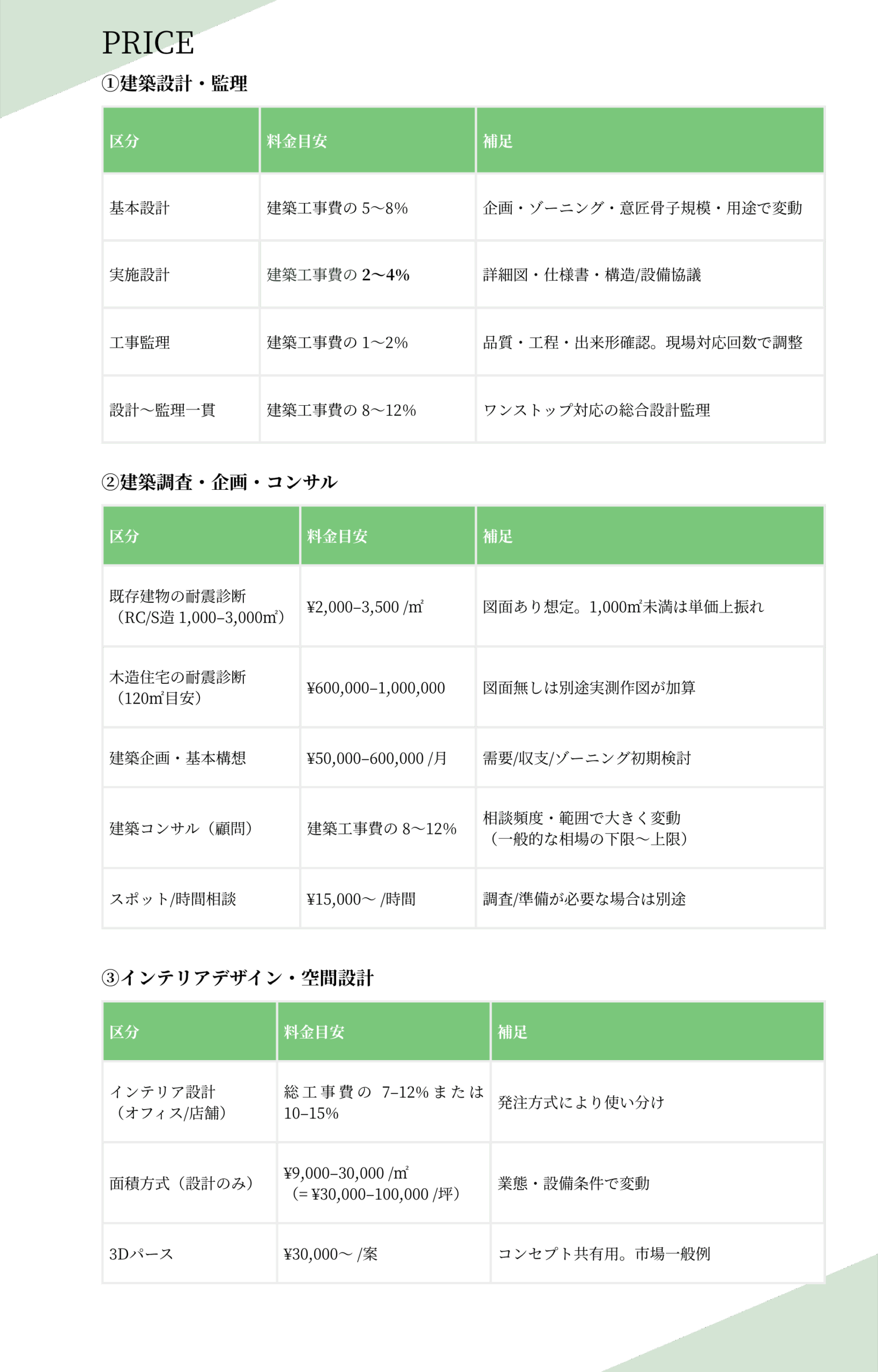 建築企画や設計監理に関する技術的助言、コスト計画、用途変更や改修計画など、スポットまたは顧問契約として柔軟に対応いたします。